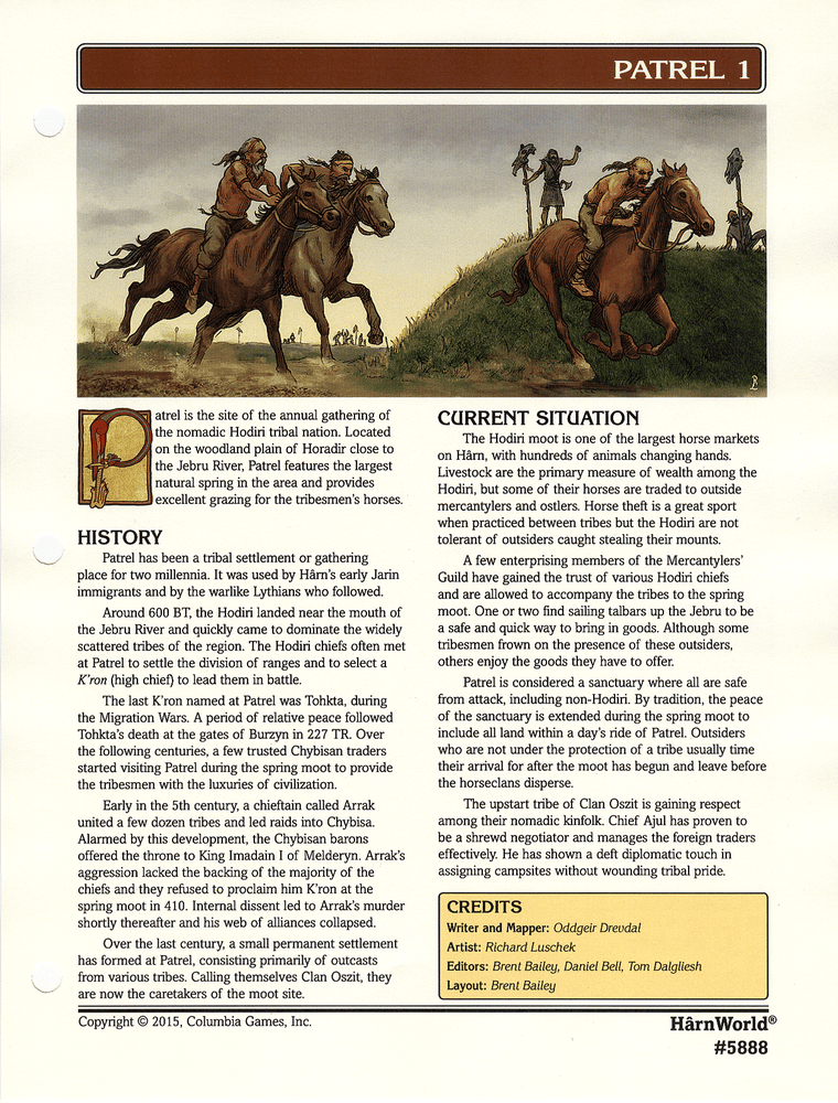 Patrel é o local do encontro anual da nação tribal nômade Hodiri. Localizado na planície florestal de Horadir, perto do rio Jebru, Patrel possui a maior nascente natural da região e oferece excelente pastagem para os cavalos da tribo.