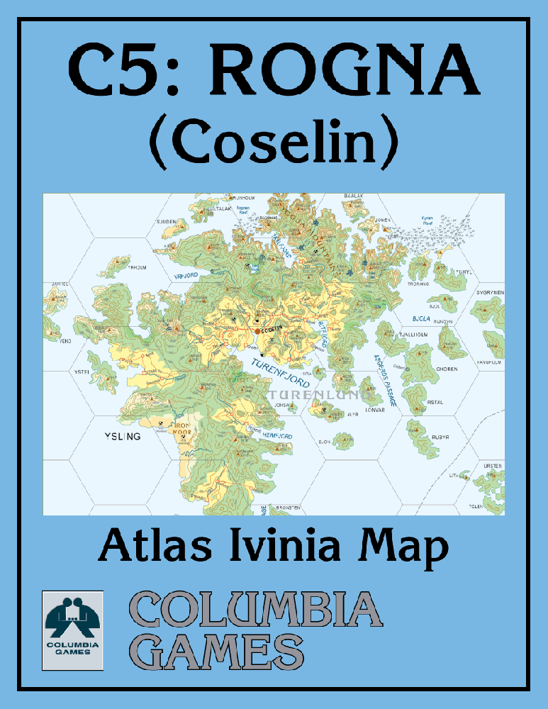 Este mapa cobre as terras ao redor de Coselin, a sede do Rei Haakis de Rogna. Como grande parte de Rogna e Ivinia, o terreno é montanhoso e possui muitos fiordes. Uma dispersão de aldeias e terras cultivadas fica principalmente ao longo da costa acidentada. Junto com seus habitantes interessantes, o terreno selvagem e o mar agitado oferecem muitas oportunidades de aventura.