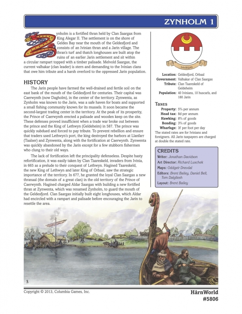 O artigo de Zynholm Thran descreve a história, o governo, a religião e a economia do assentamento e fornece detalhes sobre alguns de seus artesãos e outros locais. Inclui mapas locais coloridos do GM e do jogador, e plantas baixas para o templo da casa do clã de Sarajin.