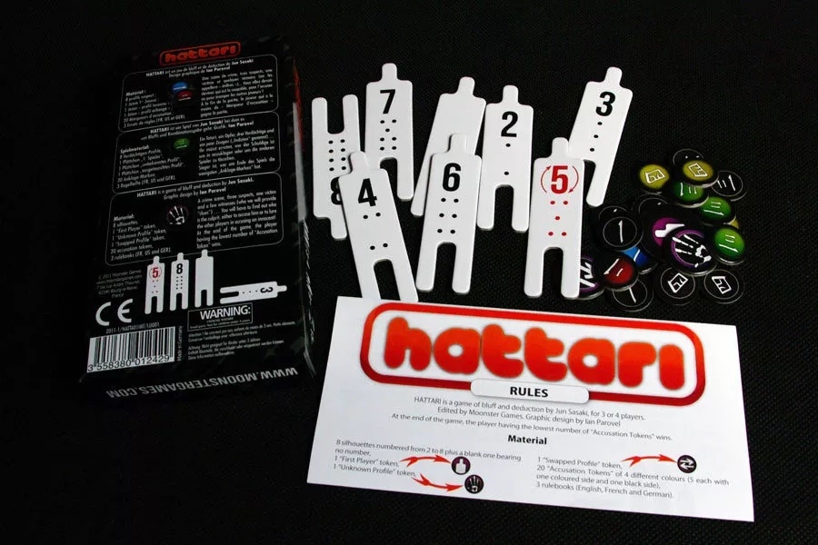 Hattari é um jogo de blefe e dedução, e o jogador que acabar com o menor número de marcadores de acusação ganha o jogo.