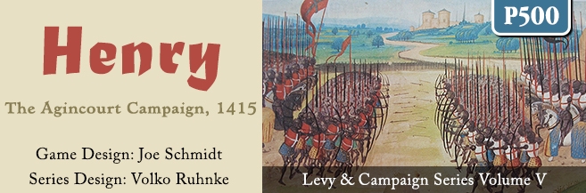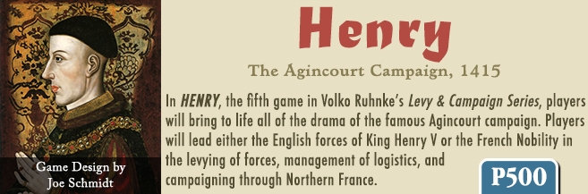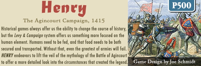 Em Henry, o quinto jogo da série Levy & Campaign de Volko Ruhnke, os jogadores darão vida a todo o drama da famosa campanha de Agincourt. Os jogadores liderarão as forças inglesas do rei Henry V ou a nobreza francesa na arrecadação de forças, gerenciamento de logística e campanha pelo norte da França. Designer por Joe Schmidt, Henry visa criar uma versão mais simplificada do Levy & Campaign que seja igualmente adequada para a primeira experiência de alguém ou para uma sessão de jogo mais rápida na hora do almoço.