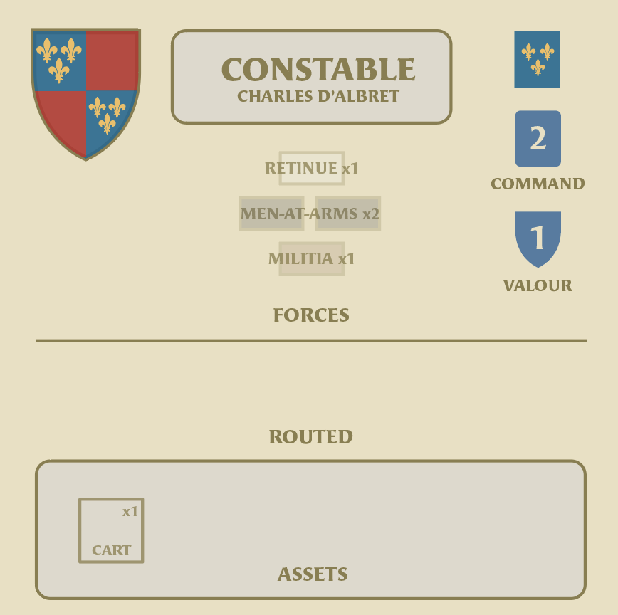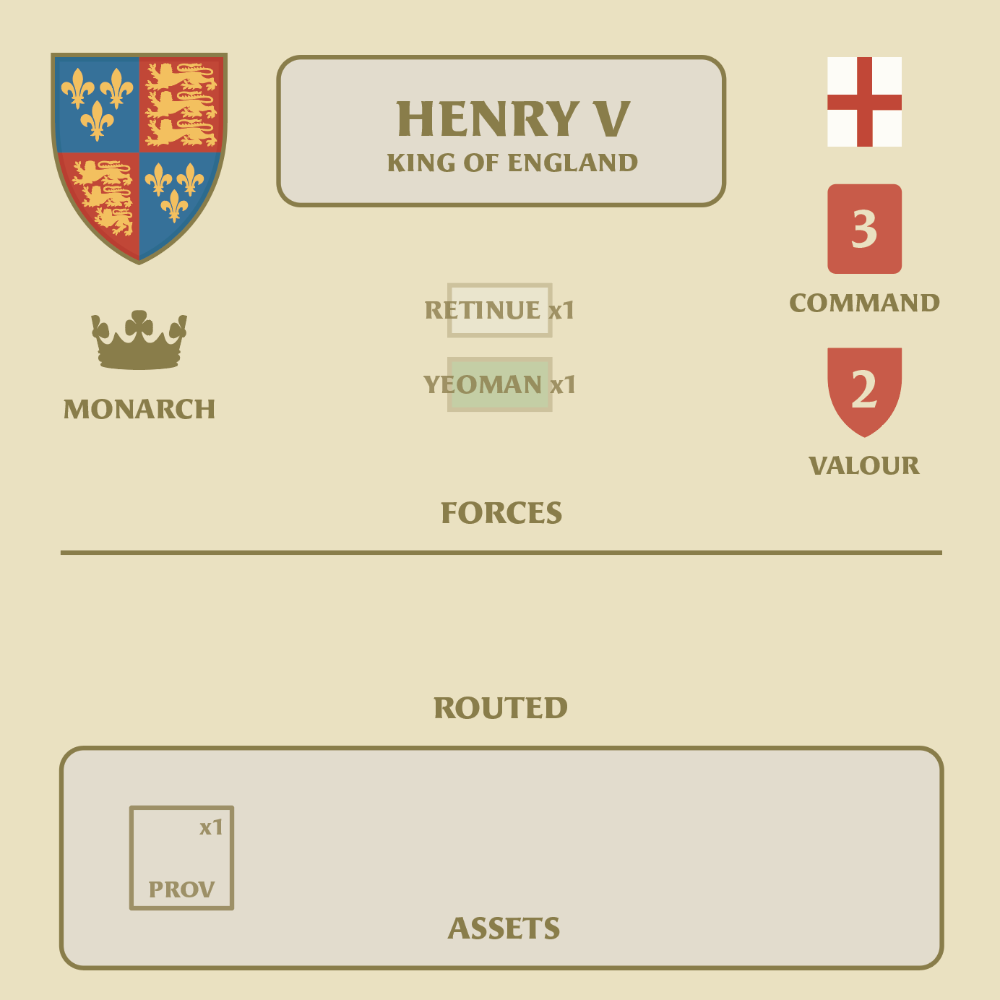 O jogador inglês construirá seu exército no início do jogo e, ao fazê-lo, definirá suas condições de vitória com base nessas escolhas e, em seguida, iniciará sua campanha. Enquanto os ingleses marcham pela Normandia, os nobres franceses precisarão responder rapidamente, reunindo suas forças e navegando na política interna da corte de sua guerra civil em andamento entre as facções Armagnac e Burgundian. Então, uma vez prontos para a batalha, os franceses tentarão caçar e impedir que o rei Hal e seus poucos felizes voltem para casa.