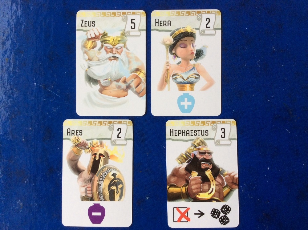 Durante a fase da acção, podes usar as habilidades das tuas cartas Semi-Deus e Deus do Olimpo (gastando cubos ou virando cartas) de modo a obteres o resultado que pretendes.