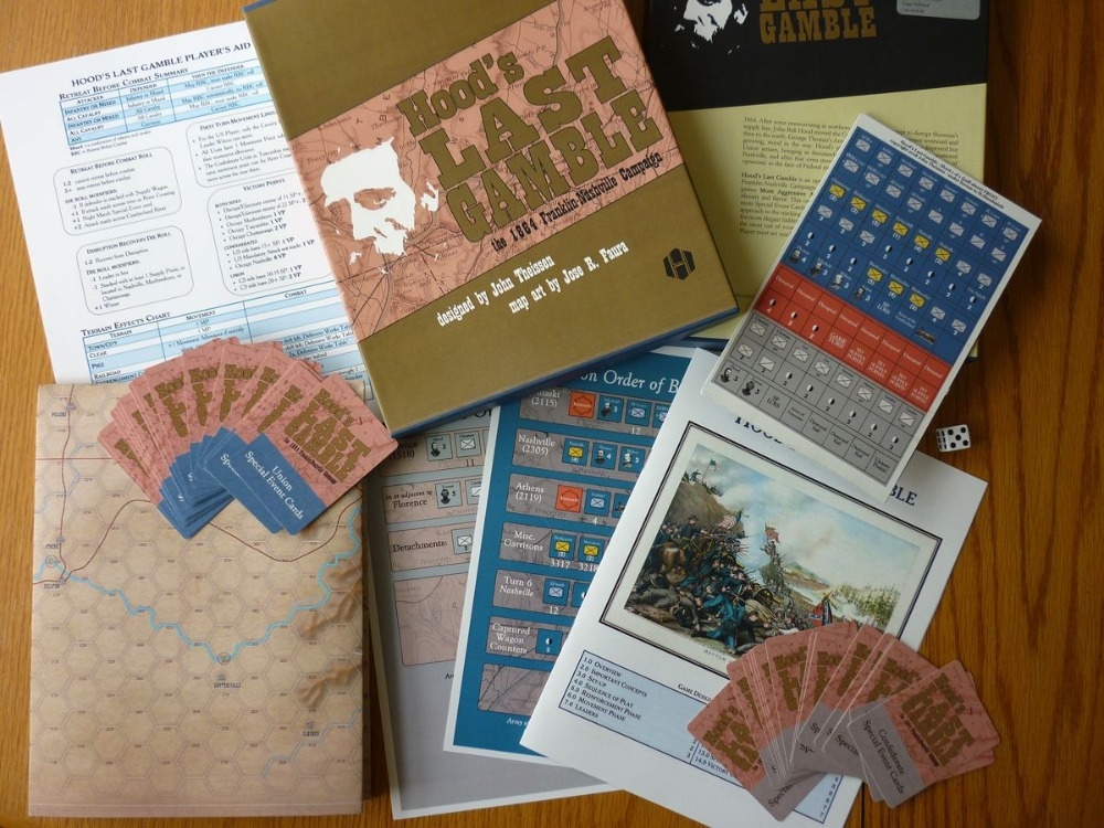 Hood's Last Gamble é um jogo de nível operacional para dois jogadores que exploram a campanha Franklin-Nashville de 1864. Ele compartilha algumas semelhanças com os jogos anteriores do designer, More Aggressive Attitudes e Objective Shreveport !, mas tem sua própria identidade e sabor. Este possui um mapa maior com muitos desafios de terreno complicado e mais cartas de eventos especiais em torno das quais você pode construir sua estratégia. Ele utiliza uma abordagem simplificada para o rastreamento dos Pontos de Força da unidade que reduz a desordem dos counters e permite oportunidades de movimentos ocultos mais elegantes. Counters de suprimentos são cruciais para obter o máximo de suas unidades e, com o inverno chegando, o Jogador Confederado deve agir de forma rápida e decisiva para mudar a história.