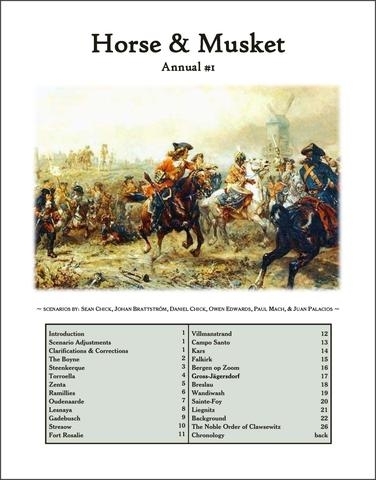 O primeiro livro de cenário anual para a série Horse & Musket de Sean Chick traz vinte novas batalhas para sua mesa de todas as eras abordadas nos três primeiros volumes. A propriedade de todos os três permitirá que você aproveite todos os vinte cenários incluídos aqui, embora alguns cenários possam ser jogados apenas com o jogo base, ou apenas uma das expansões anteriores. Para sua conveniência, a lista a seguir indica se os counters dos Volumes II ou III são necessários para jogar um determinado cenário: