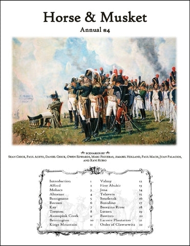 O tão esperado quarto livro de cenários para a série Horse & Musket de Sean Chick adiciona vinte novas batalhas tiradas de todas as eras cobertas em todos os jogos em caixa publicados até o momento. É necessário possuir o jogo base de uma ou mais expansões; a propriedade de todos os seis permitirá que você aproveite todos os vinte cenários.