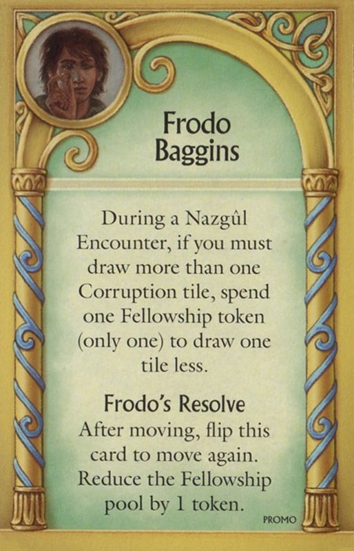 Card alternativo de Frodo Baggins concedido durante convenções, incluindo o GenCon 2018. É a mesma arte que aparece no jogo base, mas com uma habilidade diferente no card.