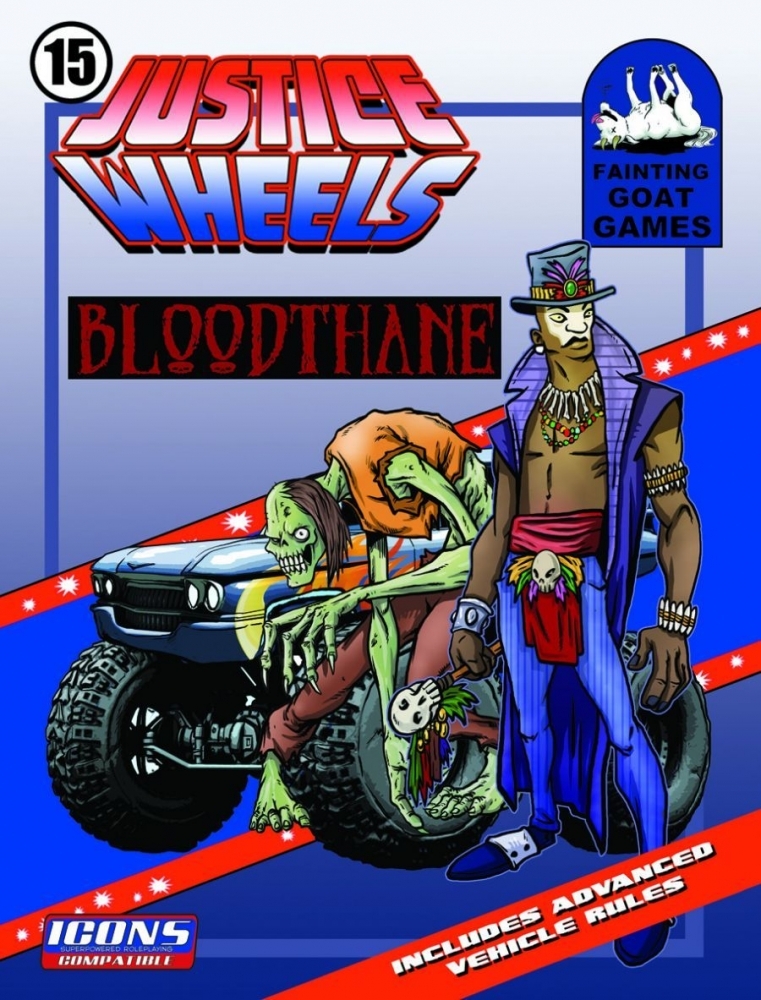 Justice Wheels # 15 apresenta o Barão Bloodthane, um criminoso mesquinho com um carro funerário envenenado que se interessa por necromancia. Apresentando novas regras de Necromancia para ÍCONES - escritas por Joe Bardales!