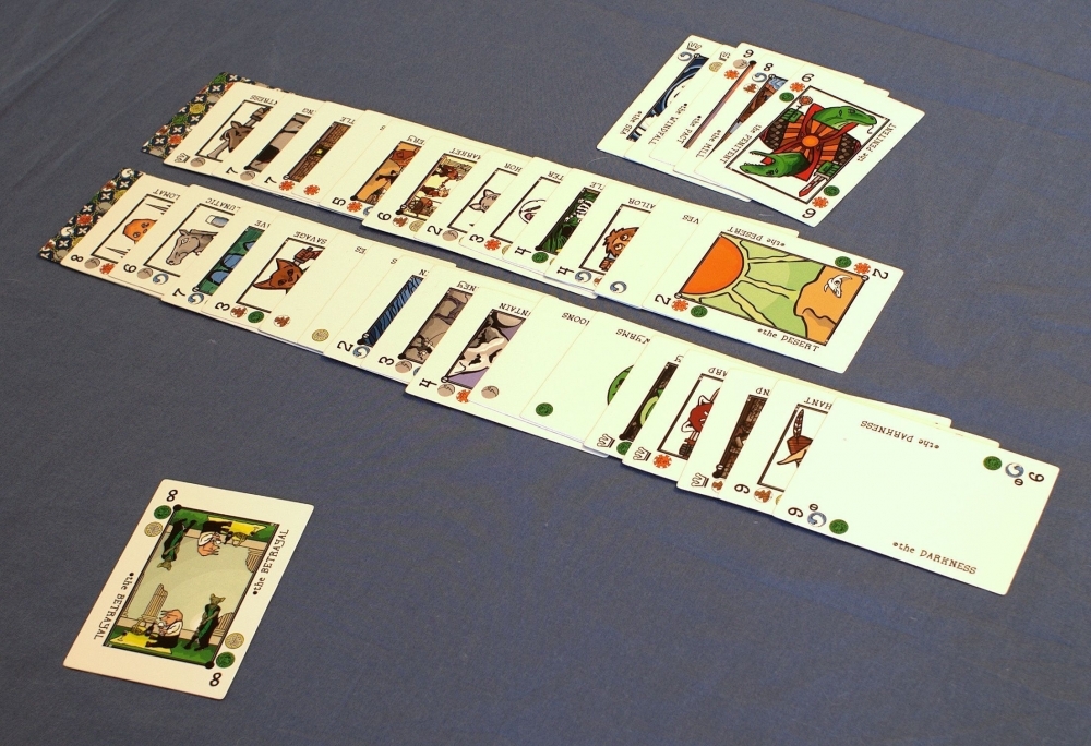 A lebre e a tartaruga estão organizando uma série de corridas! Este é um jogo de corrida de escalada assimétrico para 2 jogadores usando o sistema Decktet. Mesmo que os jogadores devam descartar a mesma quantidade de cartas, a Lebre recebe muito mais para usar (e é mais livre para usá-las) no início do jogo, mas a Tartaruga aumentará lenta e constantemente sua mão.