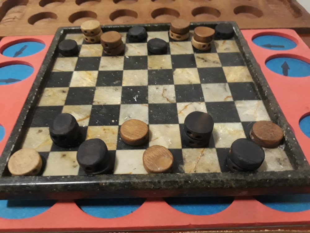 Jogado com peças de damas padrão. Peças simples movem-se diagonalmente para frente em qualquer número de quadrados. As duplas movem-se diagonalmente para trás em qualquer número de quadrados. Uma espécie de jogo de corrida e bloqueio. Empates não poderão ocorrer.