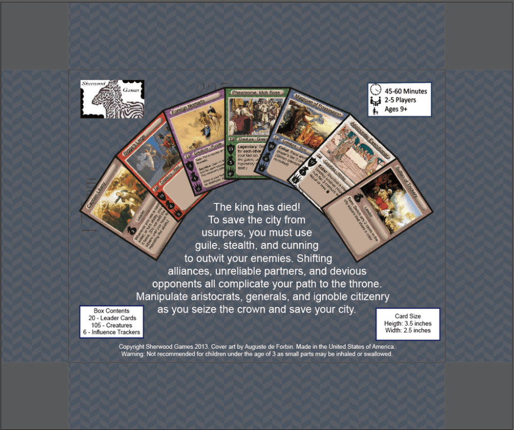 O rei morreu! Para salvar a cidade dos usurpadores, você deve usar blefe, discrição, e astúcia para enganar seus inimigos. Troca de alianças, parceiros confiáveis?? e oponentes desonestos, tudo complica seu caminho para o trono. Manipular aristocratas, generais e a cidadania ignóbil para tomar a coroa e salvar sua cidade.