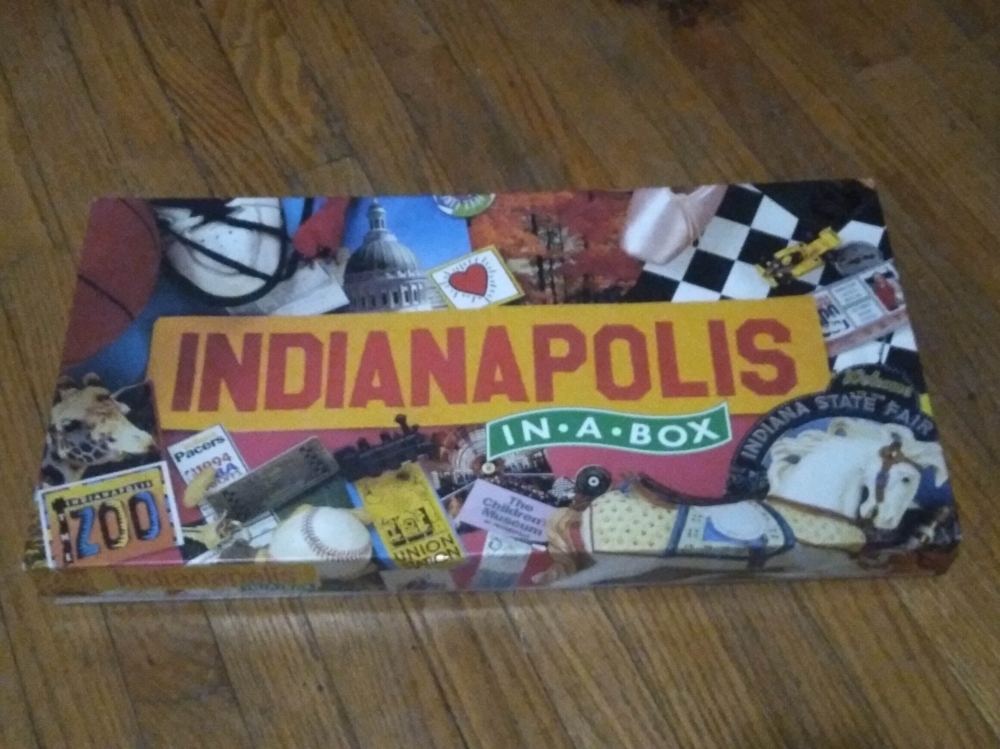 Indianapolis In-A-Box é um jogo de tabuleiro baseado na GRANDE cidade de Indianápolis. Escolhemos alguns marcos favoritos (Monumento do Circle Center) e tradições (Feira Estadual), misturados em uma grande corrida (carro de corrida Indy 500), muito basquete, engarrafamentos, chaves da cidade, GRANDE DIVERSÃO! e voilà (vwa la) - eis; lá é Indianápolis In-A-Box.