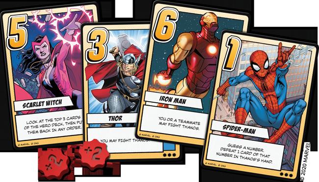 Ao longo do jogo, os jogadores se revezam tirando uma carta e jogando-a, então executando seu efeito. Os jogadores heróis podem convocar homens como Homem de Ferro, Homem-Aranha, Thor e Bruxa Escarlate por suas habilidades de batalha e reunir informações sobre os esquemas de seus oponentes. Um adversário digno, Thanos joga com uma mão de duas cartas, tirando de seu próprio deck lacaios e poderosas Pedras do Infinito. Os heróis terão que usar suas habilidades em combinações estratégicas para derrubar sua saúde a zero antes que ele possa fazer o mesmo com eles - ou encontrar todas as seis Pedras do Infinito e vencer com um estalar de dedos. Quem vai prevalecer nesta batalha pelo universo?