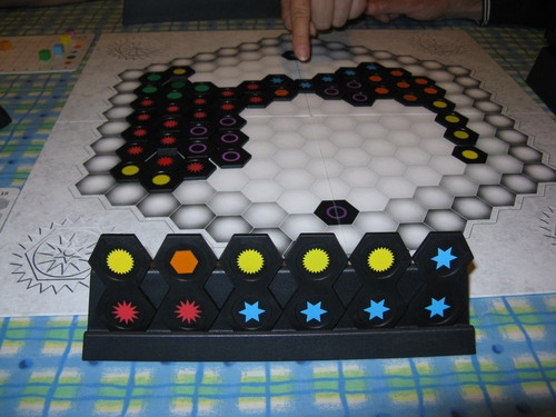 Peças na mão do jogador com partida em andamento. Tabuleiro sendo construído.