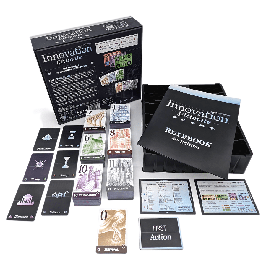 Innovation Ultimate contém o jogo base e cinco expansões. Com a introdução da Era 11, muitas das cartas do jogo base e das expansões foram atualizadas.