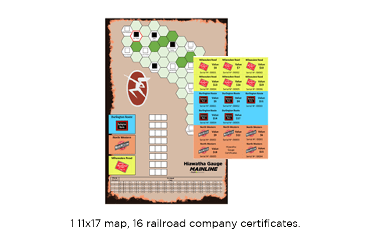 Publicado exclusivamente na edição de outono de 2021 da revista TraXX Mainline, Hiawatha Gauge é um jogo de trilhos cúbicos ambientado nas rotas dos trens históricos Milwaukee Road Hiawatha. Apresentando o comprovado sistema de jogo Irish Gauge, esta é uma variante de "jogo de revista" em um pequeno mapa com apenas três empresas. Você precisará de uma cópia do Irish Gauge para jogar este jogo.