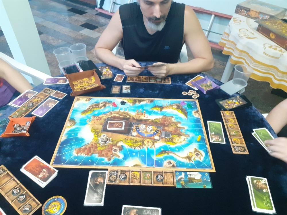 Jogabilidade: O jogo é jogado em rodadas. Cada jogador sempre tem uma mão de três cartas e um tabuleiro pessoal representando os cinco "porões" de seu navio, nos quais as mercadorias podem ser carregadas durante o jogo. A cada rodada, um jogador é designado como "capitão", com o próximo jogador no sentido horário sendo o capitão na rodada seguinte, e assim por diante. O capitão rola dois dados padrão D6, examina suas cartas e anuncia qual dado corresponderá ao "dia" e qual à "noite". Cada jogador então seleciona simultaneamente uma carta de sua mão e a coloca virada para baixo na sua frente. Cada carta tem dois símbolos, um à esquerda - correspondendo a "dia" - e outro à direita ("noite"). Os símbolos indicam o movimento do navio (para frente ou para trás) ou o carregamento de um tipo de mercadoria. Após cada jogador selecionar uma carta, todas as cartas são reveladas simultaneamente e então resolvidas no sentido horário, uma a uma, começando com a do capitão. Quando for a vez de um jogador resolver sua carta, primeiro o símbolo da esquerda em sua carta e depois o símbolo da direita, o jogador carregará um número de mercadorias ou moverá um número de espaços igual ao número de pips que aparecem no dia ou noite morrem por essa rodada. Assim, a principal decisão que cada jogador toma durante o jogo é qual de suas três cartas atuais servirá melhor em um determinado turno, dados os valores dos dados do dia e da noite. Por fim, durante a corrida, quando um jogador pousa em um local já ocupado por outro jogador, ocorre uma batalha. As batalhas são resolvidas principalmente rolando um dado de "combate", mas os jogadores podem melhorar suas chances usando fichas de "pólvora" de seus porões, se carregaram alguma em turnos anteriores. O vencedor de uma batalha pode roubar alguns bens ou tesouros do perdedor.