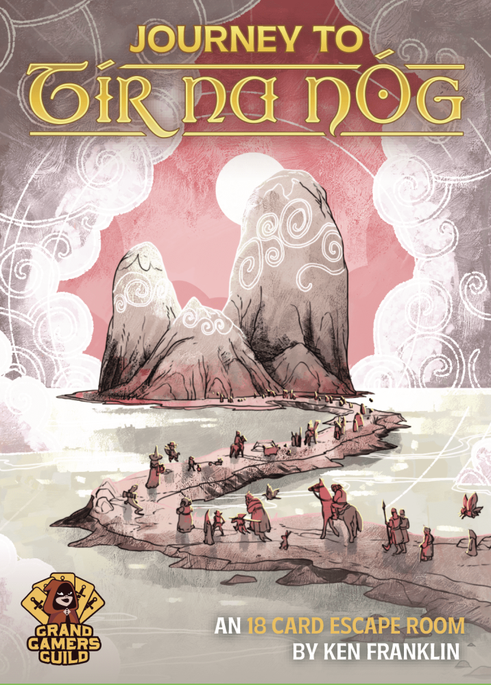 Journey to Tír na nÓg é um jogo da linha 18Escape, da Grand Gamers Guild, composta por jogos cooperativos de enigmas. Em cada jogo, você resolve um mistério completo no estilo escape room usando apenas 18 cartas! Os desafios podem testar sua percepção, jogo de palavras e raciocínio lateral. Fluência em inglês é obrigatória.