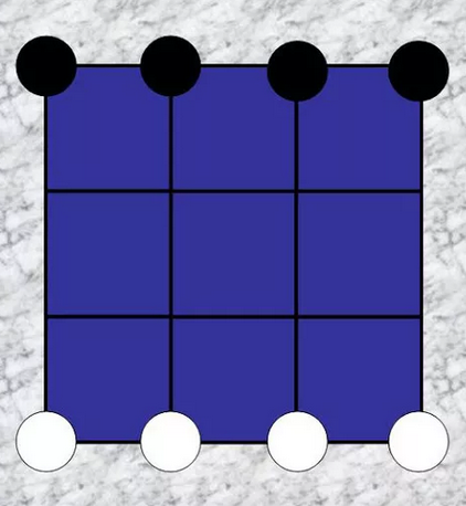 Um tabuleiro 4x4 ou 3x3 (joga-se nas intersecções) e 4 peças para cada jogador