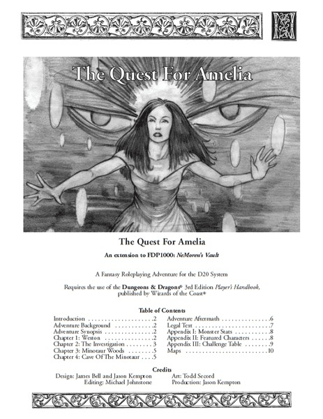 A Busca por Amelia foi projetada para 4 personagens de 2º a 3º nível e ocorre na cidade de Weston (conforme detalhado no Vault de NeMoren) e na pequena floresta localizada diretamente a noroeste dela. Esta área deve ser fácil de inserir em uma campanha existente; até a caverna do minotauro pode ser colocada em qualquer tipo de terreno; o encontro da dríade, entretanto, precisará ser removido se a caverna não estiver localizada em uma área florestal.