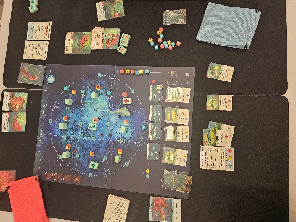 Em Kelp, os jogadores assumem o papel de polvo ou tubarão, com cada jogador tendo um caminho único para a vitória. O jogador Octopus se esgueira pelo tabuleiro jogando cartas e gerenciando suas peças ocultas e reveladas, enquanto o jogador Shark patrulha seu território e tenta caçar o indescritível Octopus rolando dados e usando habilidades especiais para mitigar sua sorte. Este jogo assimétrico é uma mistura emocionante de construção de baralho e construção de sacos de dados, bem como esconde-esconde, blefe e manipulação.