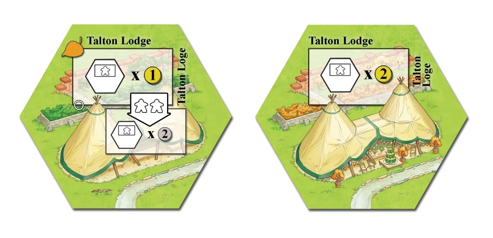 Por exemplo, se o ladrilho da Feira estivesse na aldeia do jogador e o jogador também possuísse o ladrilho do Talton Lodge, o ladrilho do Talton Lodge marcaria 2 pontos para a Feira ou 4 pontos se o ladrilho do Talton Lodge fosse atualizado. Se o ladrilho da Feira fosse atualizado, o ladrilho do Talton Lodge marcaria 3 pontos para a Feira ou 6 pontos se a Feira também fosse aprimorada.