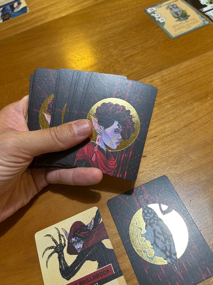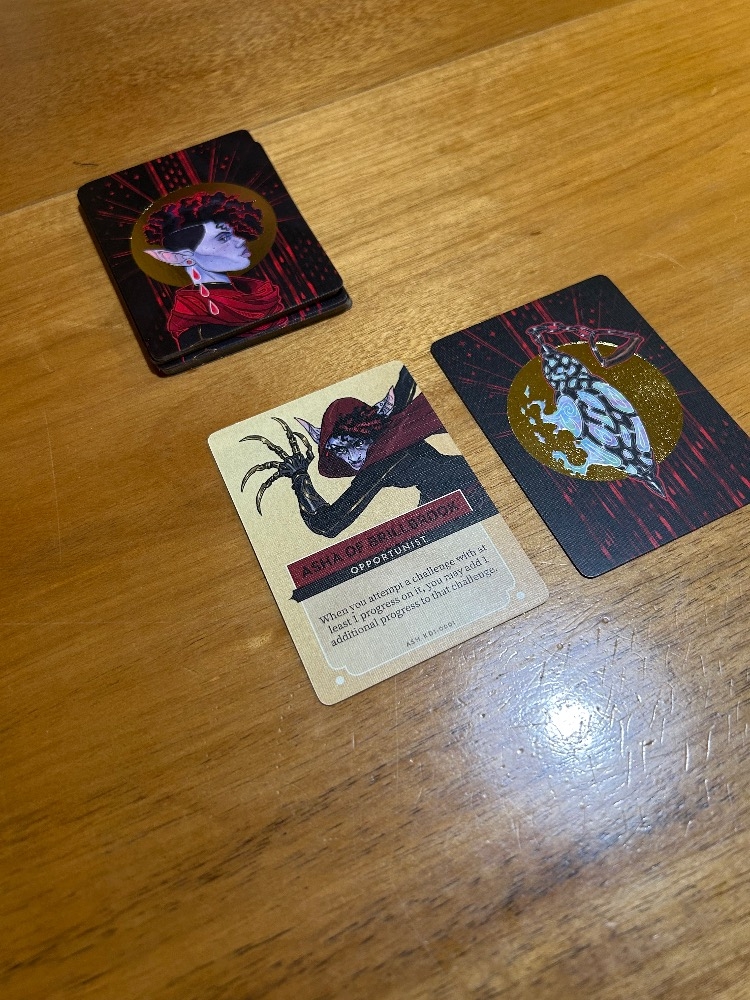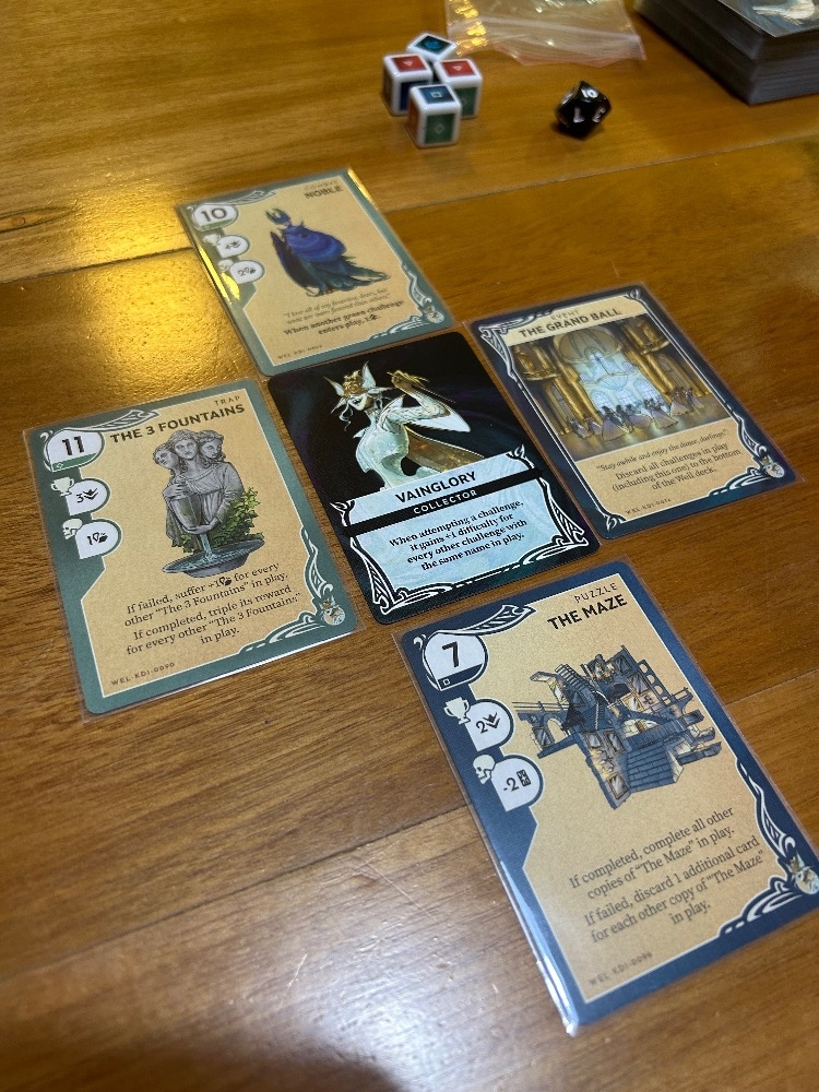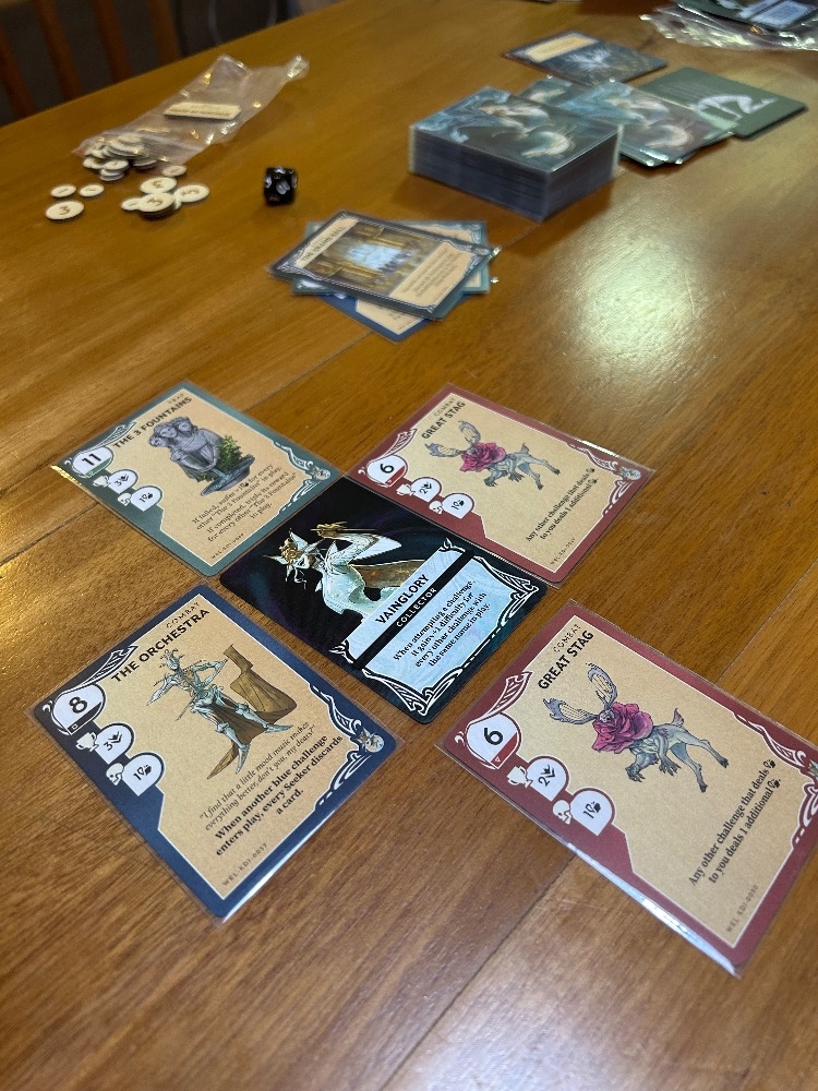 Vainglory's Well é composto por quatro cartas de desafio, com a própria Vainglory no meio. À medida que um desafio é derrotado, outro assume seu lugar, com 52 cartas de desafio no total. Ao enfrentar os desafios do Poço, você só pode jogar uma carta de habilidade de sua mão que corresponda à cor da carta de desafio. Ou seja, se você estiver enfrentando uma carta de desafio vermelha, poderá jogar apenas uma carta de habilidade vermelha. Algumas cartas terão duas cores e algumas cartas são brancas ou selvagens. Se a carta que você joga não vencer o desafio, você poderá adicionar algum progresso a ela e tentar novamente, embora possa sofrer uma penalidade por isso. Outros Buscadores podem fornecer ajuda jogando uma de suas próprias cartas como reforço, mas cuidado. Ficar sem cartas resulta em Exaustão antes que você possa comprar uma nova mão. Cartas de exaustão nunca são boas, mas algumas são piores que outras.