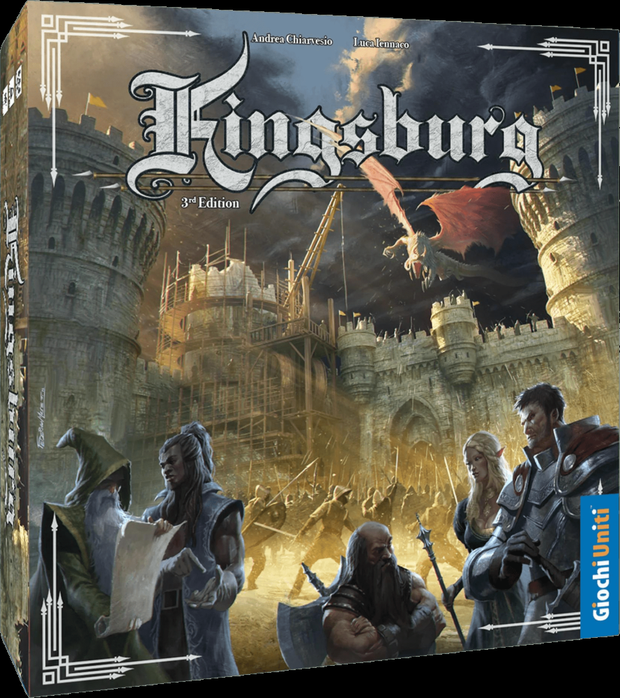 Kingsburg: 3ª Edição inclui o livro de regras mais atualizado e os melhores módulos de expansão desenvolvidos desde sua 1ª edição, como as fichas de Soldado, as cartas de Governador e os edifícios extras. Além disso, a arte e o design foram renovados, e os componentes redesenhados.