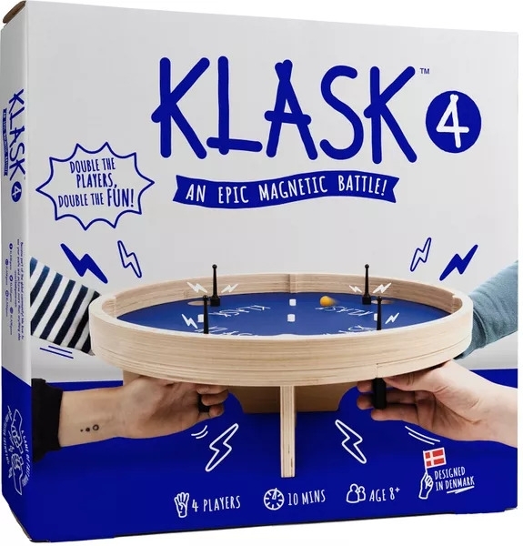 O KLASK 4 apresenta a jogabilidade do KLASK, mas dentro de uma área de jogo redonda com quatro gols para que quatro jogadores possam competir ao mesmo tempo.