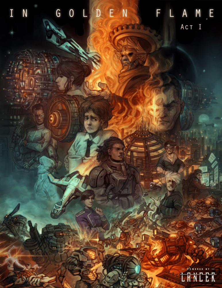 In Golden Flame Act 1 é a primeira parte de uma campanha de três partes para o sistema de RPG de mesa Lancer da Massif Press. Você assume o papel de pilotos mecânicos no sistema fronteiriço de Calliope, um lugar estranho cheio de rejeitos da sociedade utópica de Union. Da estação de mineração remota de Hell's Gate, você deve defender o sistema de piratas, corporações exploradoras... e de um culto estranho e sombrio que tenta provocar o apocalipse.