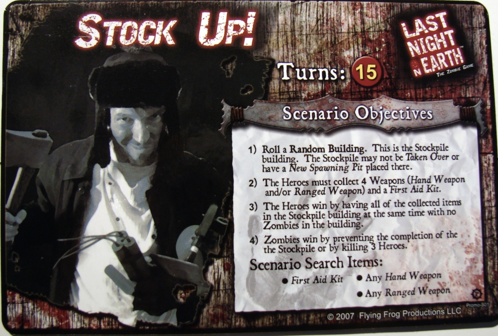 O Suplemento 'Stock Up' é exclusivo para Last Night on Earth: The Game Zombie e apresenta um novo cenário e dez novos cartões de jogo. Todas as peças são impressas no mesmo papel cartão de alta qualidade como o tabuleiro. Os cartões são exclusivos para este suplemento e não estará disponível em qualquer outro lugar. Dispõem de arte inteiramente nova e algumas novas mecânicas de jogo, como o "sacrifício" .