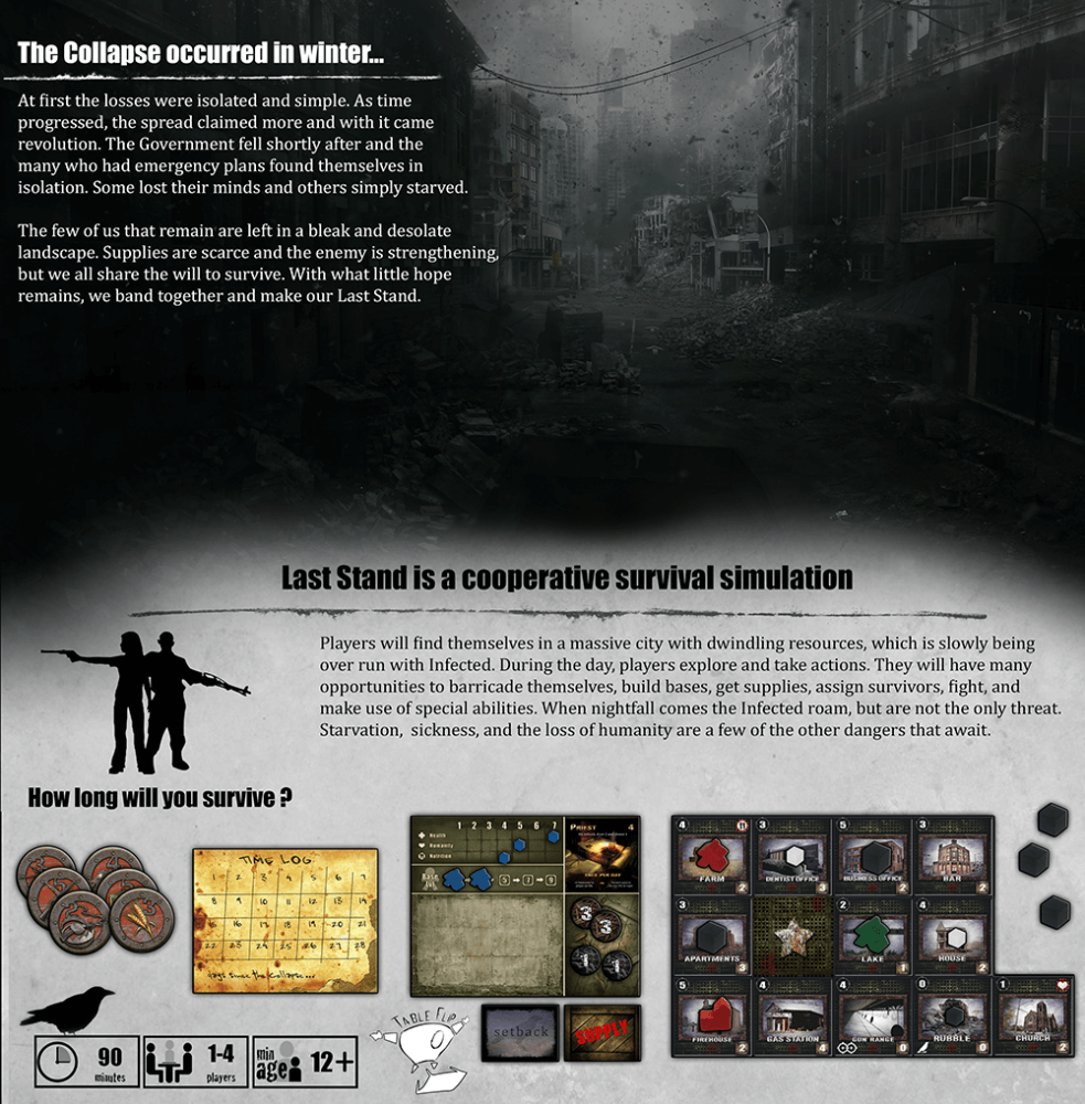 Last Stand é uma simulação de sobrevivência cooperativa. Os jogadores se encontrarão em uma cidade enorme, com poucos recursos que estão lentamente sendo inundados por Infectados. Durante o dia, os jogadores podem explorar e tomar medidas de segurança. Eles terão muitas oportunidades para construir bases, obter suprimentos, designar sobreviventes, lutar e fazer uso de habilidades especiais. Quando a noite cai, os Infectados vagueiam, mas eles não são a única ameaça. A fome, a doença e a perda da humanidade são alguns dos outros perigos que o esperam.
