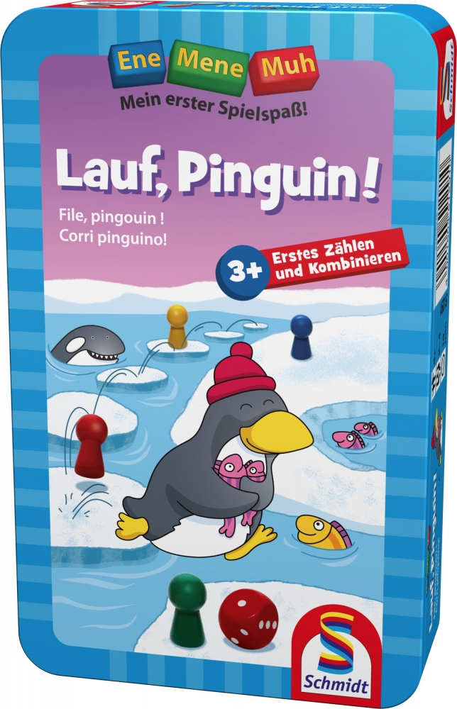 Em Lauf, Pinguin!, quatro pequenos pinguins estão a caminho do parque de diversão dos pinguins, pulando de blocos de gelo em blocos de gelo enquanto também tenta colher anchovas e sardinhas.