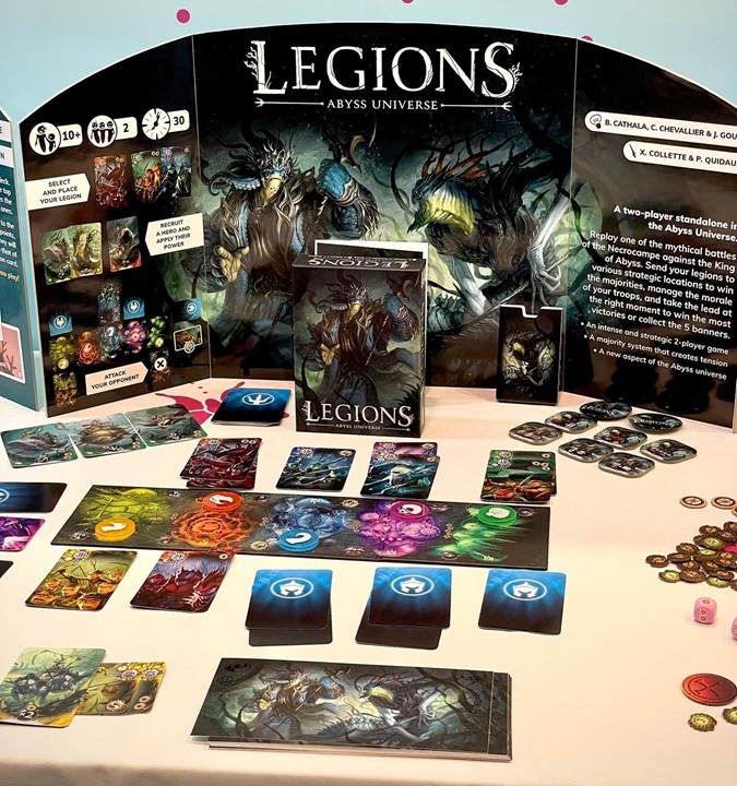 Legions é um jogo para dois jogadores ambientado no universo Abyss, no qual os jogadores competem para reinar sobre os distritos da cidade e, por extensão, sobre o Trono do Reino. A cada turno, jogue uma carta de legião do seu lado da cidade do Abismo, tente recrutar um herói de guerra e ganhe a influência majoritária dos diferentes distritos para obter poderes específicos.