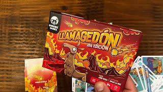 Llamagedón é um jogo de cartas leve e ligeiramente estratégico que combina mecânicas como manuseio de mãos, pegue isso e colete conjuntos. Na sua vez, um jogador tira uma carta do baralho. Se eles comprarem uma carta de Abrigo, devem jogá-la imediatamente, colocando-a no chão. Abrigos também podem ser construídos combinando recursos. Além de jogar ou construir abrigos, um jogador pode usar uma carta de ação que pode envolver atacar ou comprar abrigos, trocar uma carta por outra, pular a vez do próximo jogador, proteger seu abrigo, tirar duas cartas do baralho ou até mesmo cancelar o ação. de outro jogador.