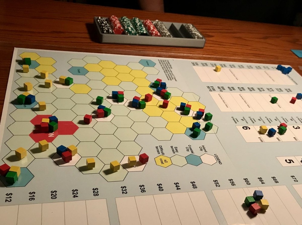 O tabuleiro mostra um mapa da Inglaterra, e cada jogador recebe 15 cubos para construir o trecho. As ferrovias emitem ações e, a cada rodada, um jogador pode comprar tecnologia para sua ferrovia. Determine quantos trilhos podem ser construídos na rodada, compre ou alugue trilhos e pague dividendos.