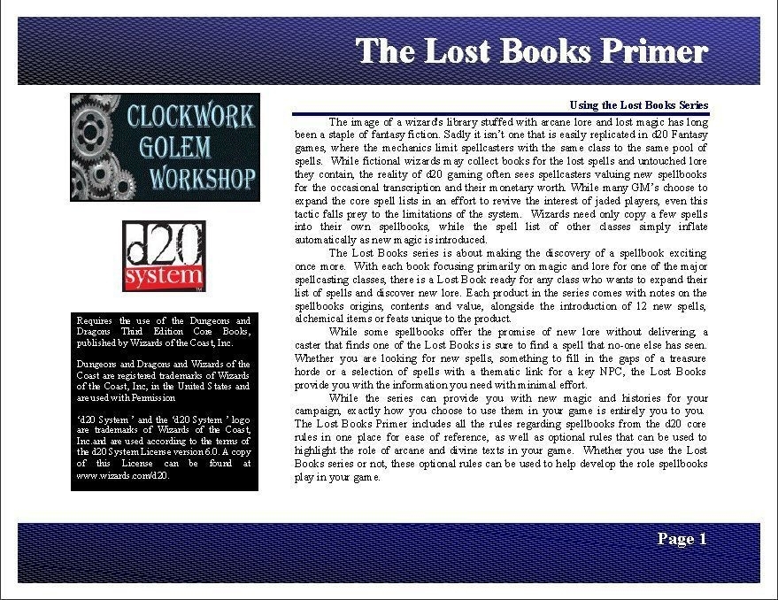 O Lost Books Primer inclui todas as regras relativas aos livros de feitiços das regras básicas do d20 em um só lugar para facilitar a referência, bem como regras opcionais que podem ser usadas para destacar o papel dos textos arcanos e divinos em seu jogo. Se você usa o Lost