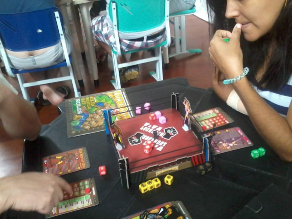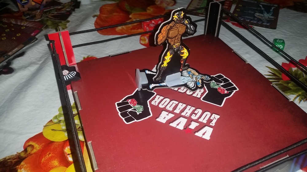 E esse é mesmo o espírito do jogo, um autêntico "Telecatch". Nele, você (ou vocês, já que pode ser jogado em dupla, inclusive usando a batida na mão do parceiro para sair do ringue) deve usar dados para lutar, cujas opções são golpear, contra golpear, bloquear, prender ("PIN") ou mesmo errar. Quando preso, o adversário tem que usar outro dados para atingir uma determinada combinação, enquanto você bate com a mão na mesa fazendo a famosa contagem até 3. E não acabou! Se saírem dois dados de golpe, você pode trocá-los pelo golpe característico do seu Luchador! Ainda no espírito do jogo, todos os dados que forem jogados devem permanecer no ringue (tabuleiro), ou são desconsiderados. Diversão garantida!