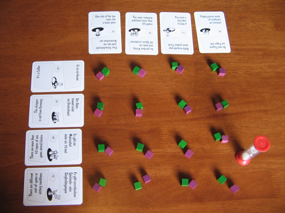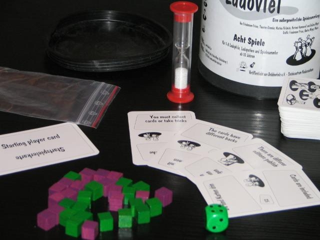 As 120 cartas mostram características de material de jogo, os mecanismos, as categorias etc. Com estas cartas, a ampulheta e os pedaços de madeira você pode jogar oito jogos cujo desenvolvimento foi inspirado em jogos bastante conhecidos.