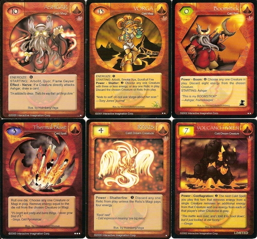 Exemplo de cartas de Cald: dois magi, uma relíquia, um feitiço e duas criaturas.