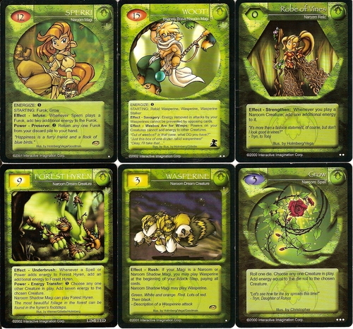 Exemplo de cartas de Naroom: dois magi, uma relíquia, duas criaturas e um feitiço.