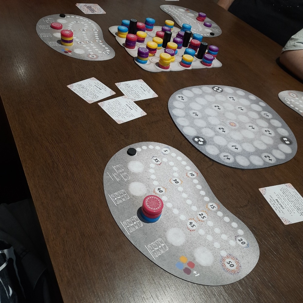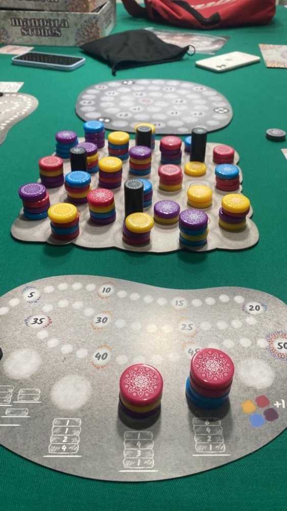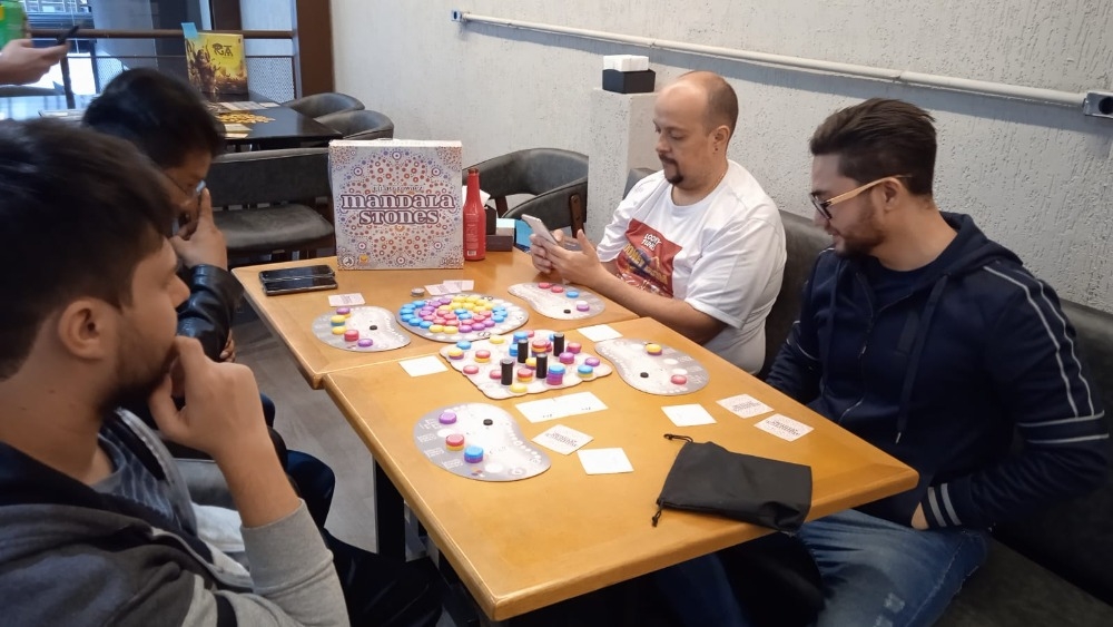 Se um jogador não puder escolher nem pontuar OU se uma pedra colocada na mandala central cobrir o espaço do final do jogo com base no número de jogadores no jogo, complete a rodada para que todos tenham o mesmo número de turnos. Cada jogador pode então marcar uma das duas cartas de objetivo secreto em sua mão, então o jogador com mais pontos vence.