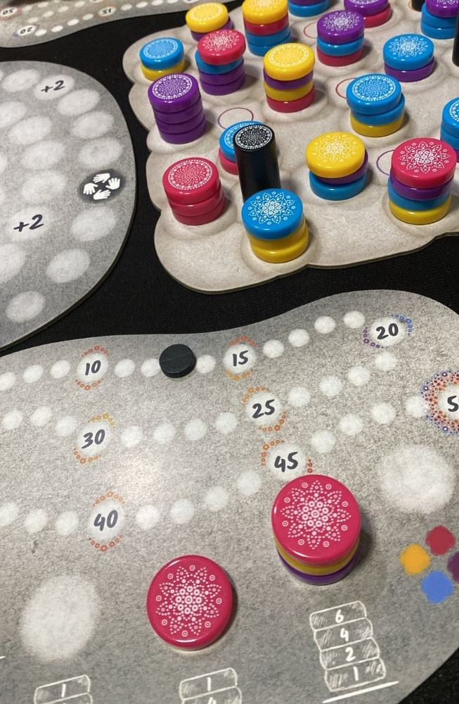 Para pontuar, escolha remover (1) uma cor que aparece nas pedras do topo de pelo menos duas torres no seu tabuleiro de jogador ou (2) qualquer número de pedras no topo do seu tabuleiro de jogador. Neste último caso, você ganha 1 ponto para cada pedra removida. No primeiro caso, você ganha pontos para cada pedra removida dependendo da condição de pontuação para aquele espaço no seu tabuleiro de jogador, que pode ser baseado na altura daquela pedra em uma torre ou no número de cores naquela torre ou na altura de todas as torres do seu tabuleiro. Coloque todas as pedras removidas na mandala central compartilhada, construindo de dentro para fora e possivelmente marcando pontos dependendo dos espaços que você cobrir.