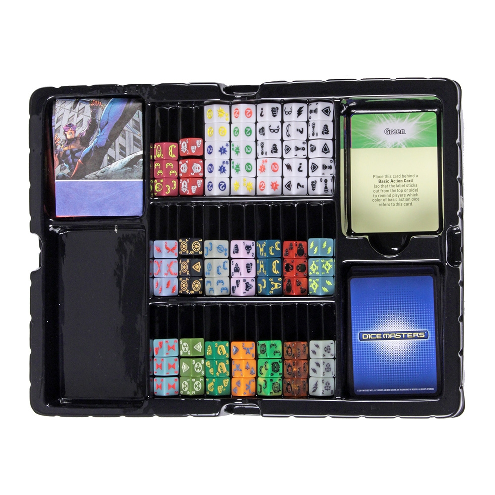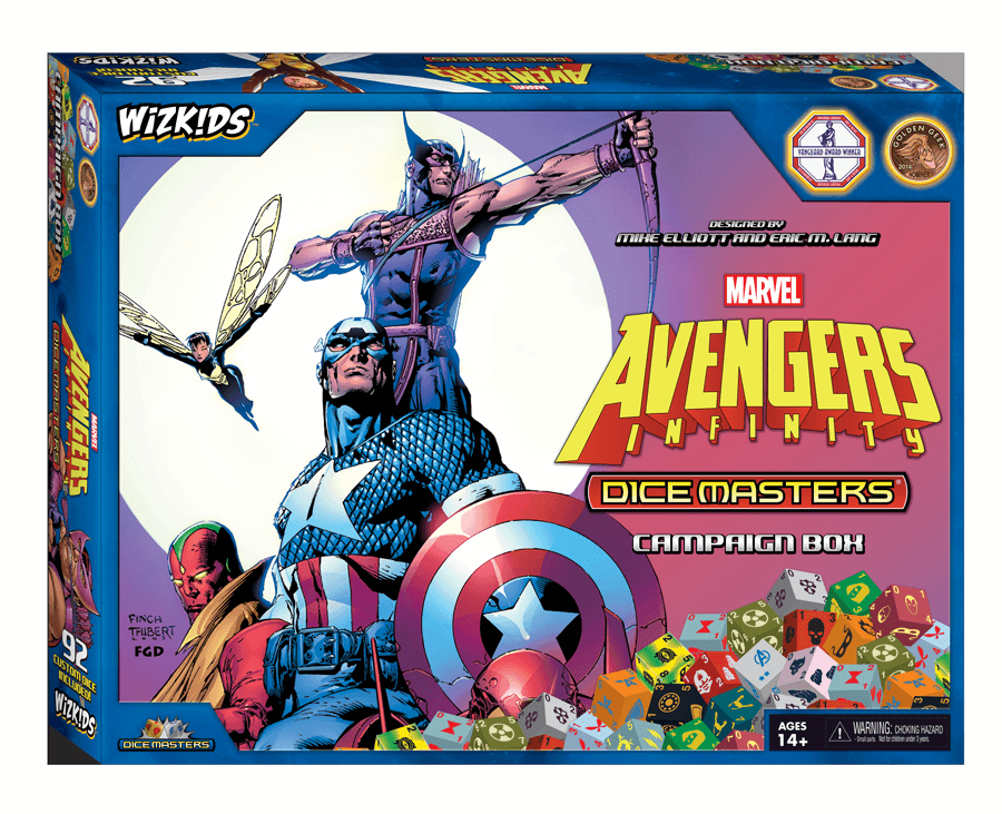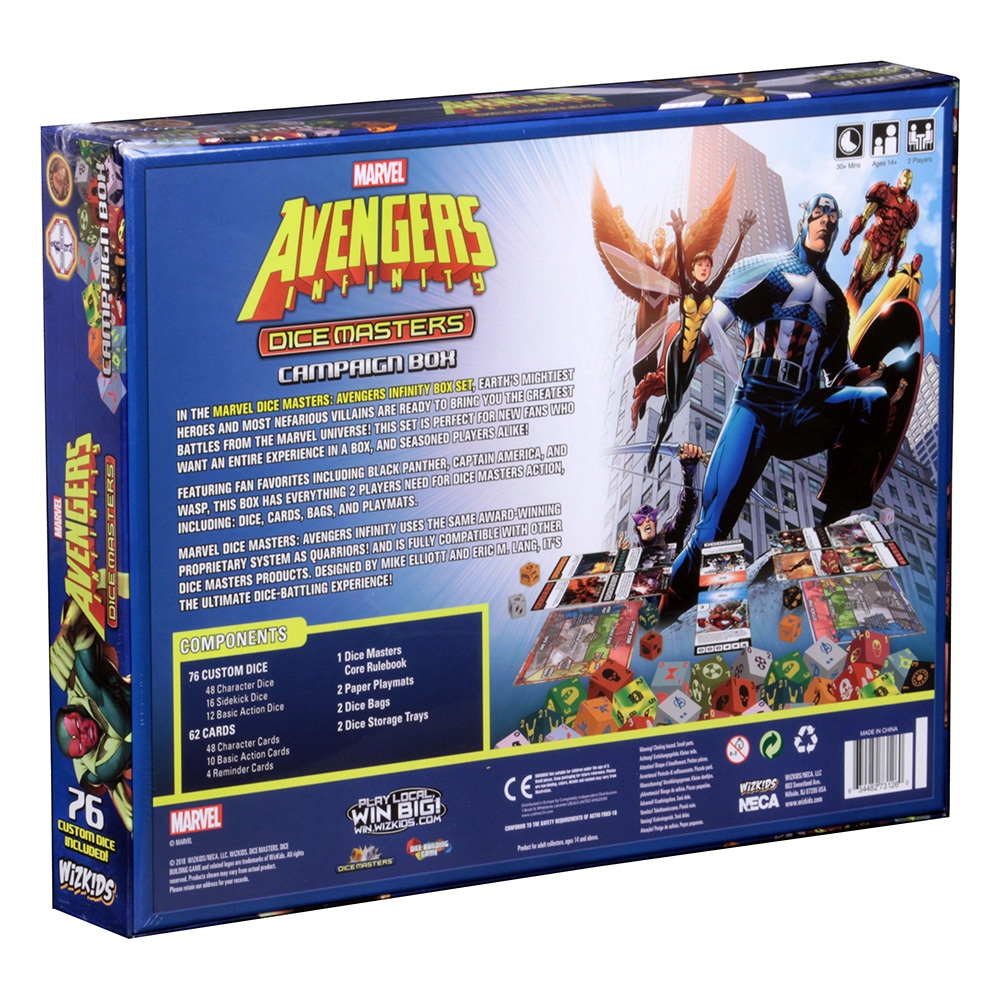Marvel Dice Masters: Avengers Infinity Campaign Box é jogo base com conteúdo fixo (em vez de dados e cartas inseridos aleatoriamente) e tem tudo que dois jogadores precisam para começar a jogar, como dados de sidekick, dados básicos de ação, sacolas de dados e regras. Esta caixa de campanha tem 48 cartas de personagem diferentes, com mais de uma dúzia de personagens que podem ser usados para construir centenas de equipes diferentes.