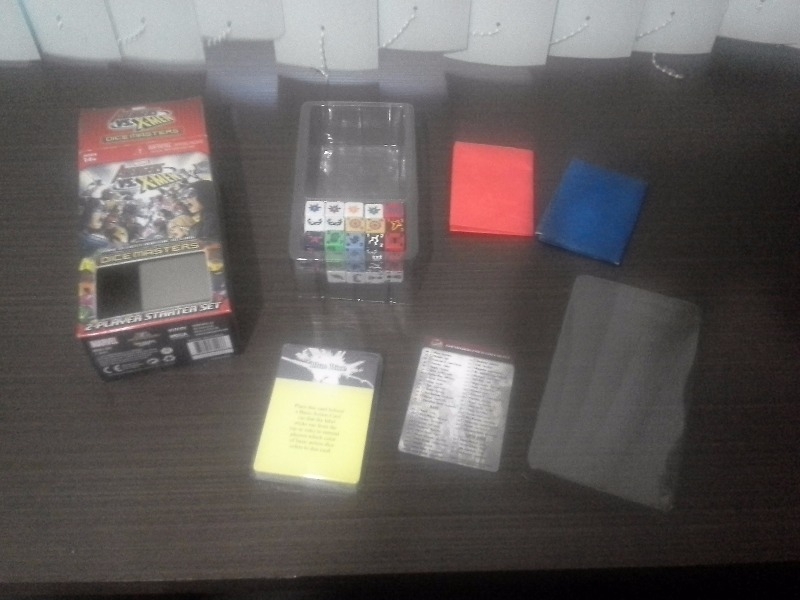 Marvel Dice Masters: Avengers vs. X-Men vem com 44 dados personalizados, 38 cartas, dois sacos, e um livro básico. Booster packs incluem dois dados, com duas cartas de personagem correspondente.