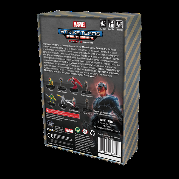 Avengers Initiative, a primeira expansão de Marvel Strike Teams, apresenta alguns dos mais poderosos vilões da Marvel, incluindo Loki, o deus asgardiano do mal, e Ultron, o pretenso conquistador do mundo. De pé contra eles estão alguns dos mais poderosos heróis da Terra, incluindo Visão, Viúva Negra e Falcão, acompanhados por seu aliado da S.H.I.E.L.D., agente Phil Coulson. No entanto, os cérebros vilões não são isentos de seus próprios aliados, incluindo o inimitável Homem Absorvente e o imprevisível Agente Grant Ward. Acompanhe as suas estatísticas de jogo para jogo em toda a sua campanha usando o disco de combate HeroClix.