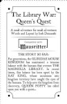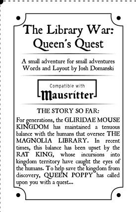 The Library War: Queen's Quest é uma aventura point crawl contida nos limites de um mini-zine, adequada para uso com Mausritter ou qualquer sistema com pequenos aventureiros. Assuma o papel de um rato em uma missão, contornando uma biblioteca cheia de humanos, um gato muito gordo e os inimigos do Reino Gliridae.