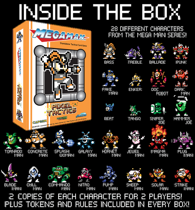 Mega Man Pixel Tactics: Bass Orange Edition é uma caixa contendo duas cópias de todos os stretch goals da campanha do Kickstarter, incluindo todos os social goals, trazendo um total de 28 personagens novos diferentes para a mesa! Ele também é jogável por conta própria.