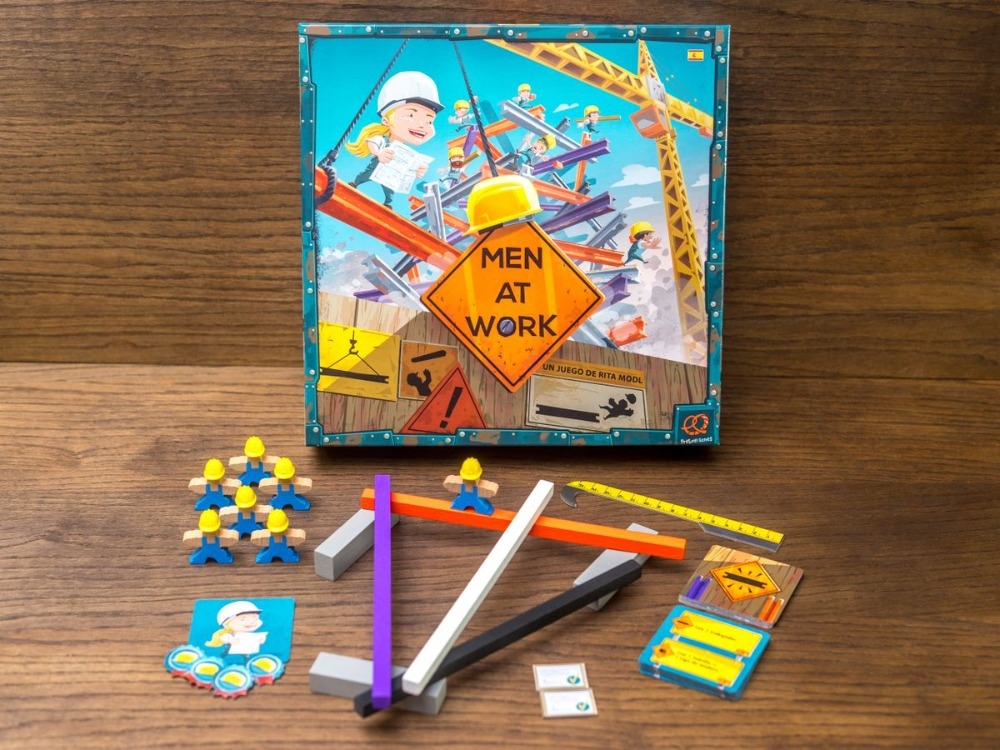 Men At Work é um jogo de empilhamento e equilíbrio em que os jogadores competem como trabalhadores em um local de trabalho que estão construindo uma torre cuidadosamente para evitar acidentes e, talvez, ganhar o prêmio de Empregado do Mês. O jogo inclui três módulos de jogo para adicionar muita capacidade de reprodução, bem como componentes de madeira alojados dentro de uma inserção bem projetada para fácil configuração.