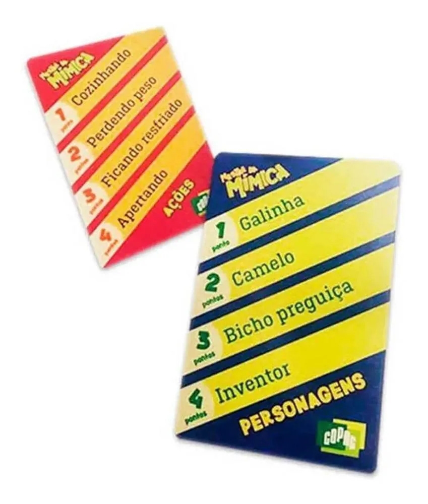 Neste jogo incrível, você irá encontrar 4 categorias diferentes de cartas: PERSONAGENS, AÇÕES, LUGARES e COISAS, cada categoria possui palavras com pontuações diferentes que